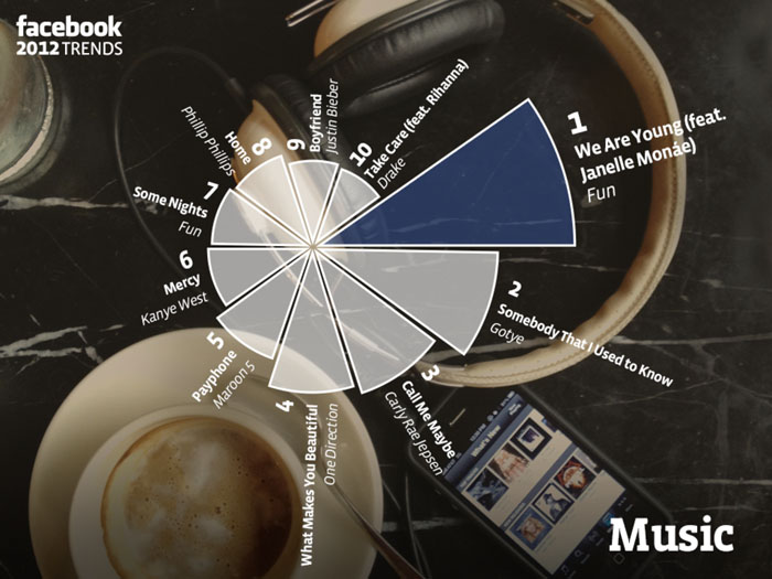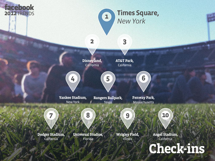 Facebook also listed out the most popular songs and checkins on the social network for each country, as well as the most popular memes, movies, most-read books and more for the U.S in particular.