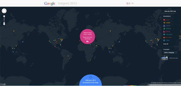 When the clock struck midnight and 2013 was born, many of us quietly resolved to change something. This will be the year we will lose those extra 10 pounds, be kinder to our friends, learn a new language, change career paths, fall in love, and so on. A combination of Google's celebrated mapping and translation technologies, wrapped in a charming design, the new tool encourages users to write down those goals and show the world what improvements 2013 may bring.