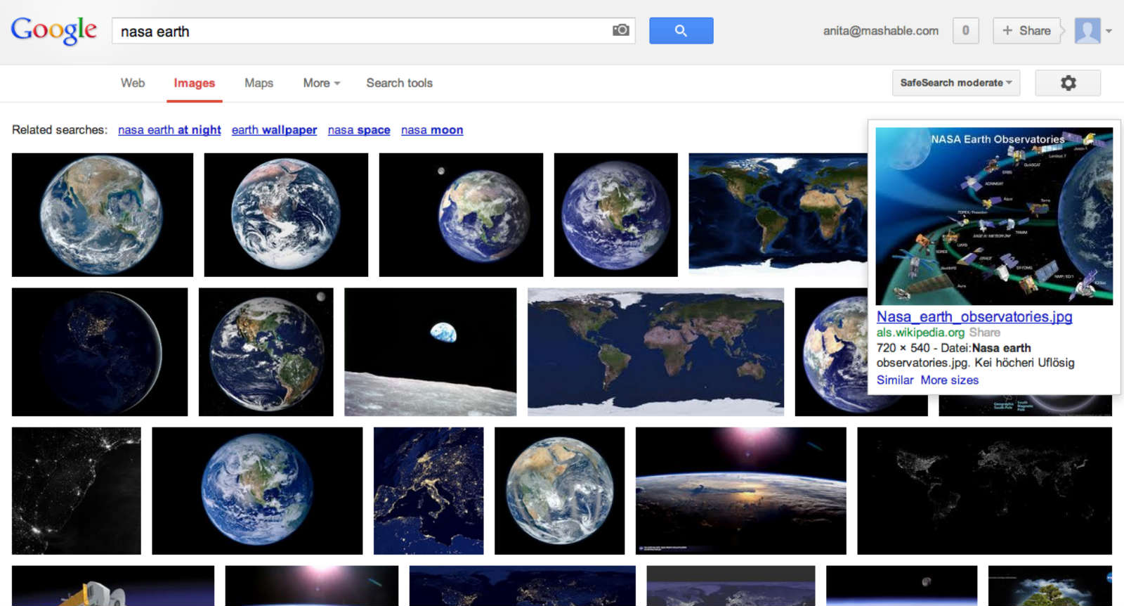 Google Images currently shows a grid of thumbnails. Users must hover their cursor over a photo to see the metadata. They must click on the image to enlarge it, and then click again to visit the host site.