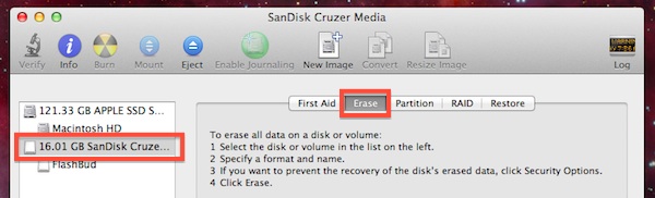 - Click the drive name on the left side list in Disk Utility, and then click the “Erase” tab