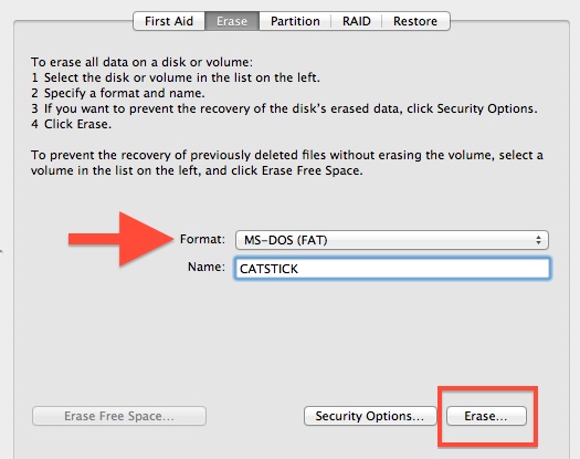- Click the pulldown menu alongside “Format” and choose option “MS-DOS (FAT)”